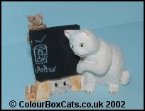 White Arthur cat leaning against a blackboard and easel, on which is drawn a tin of cat food, Arthur and a tick. On top of the blackboard is a brown mouse. Behind the model is a diploma tied with a ribbon, and to the left of the model is a rubber, and a chalk. A second model was included with this one, and is a pair of kittens, one orange and one grey sitting on books, each wearing a mortar board.